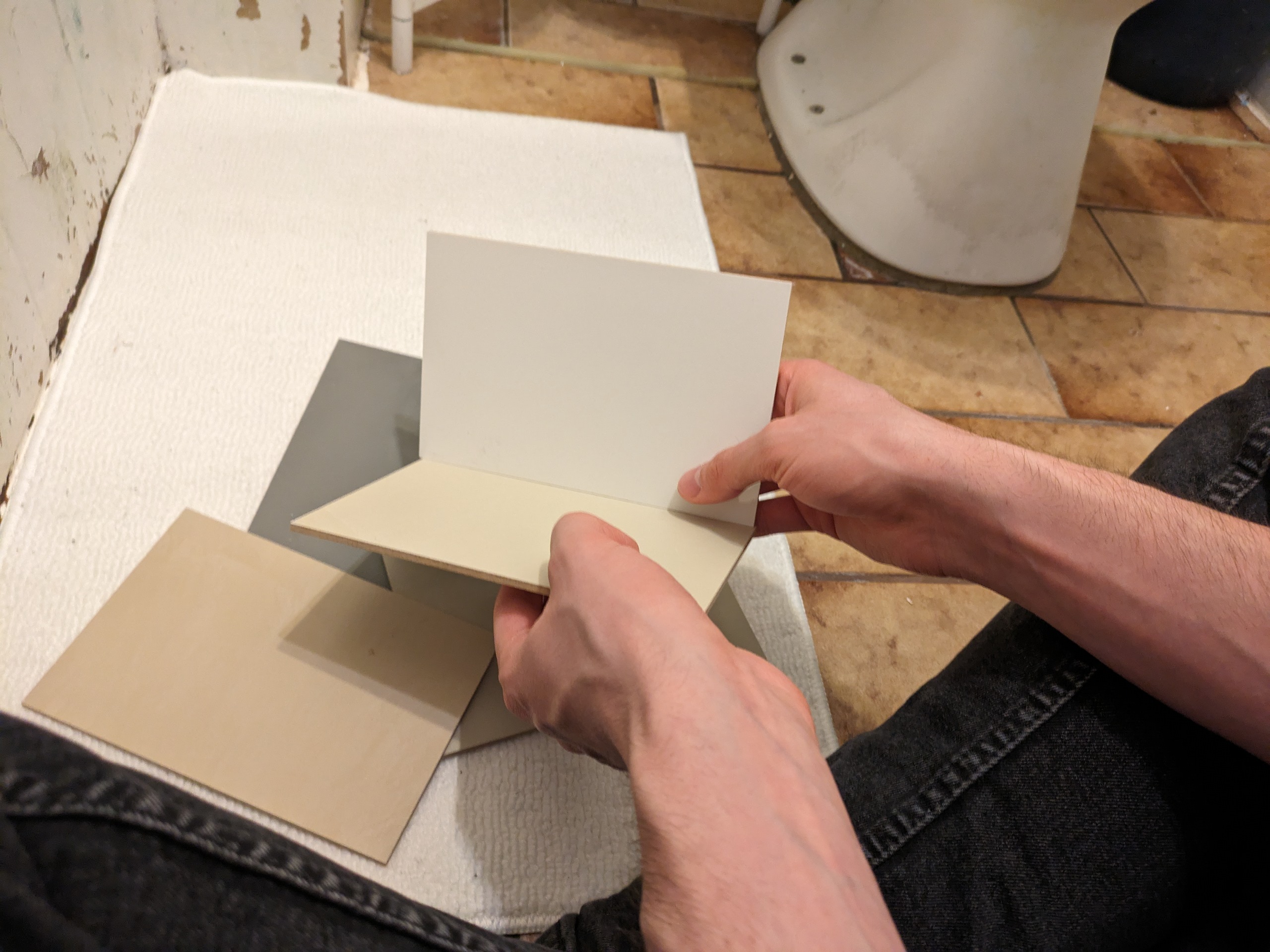 Urban Hald colors ”Lyskanvas” on floor ”Signalhvid” on walls And some white paint above tiles with contrast or not?
